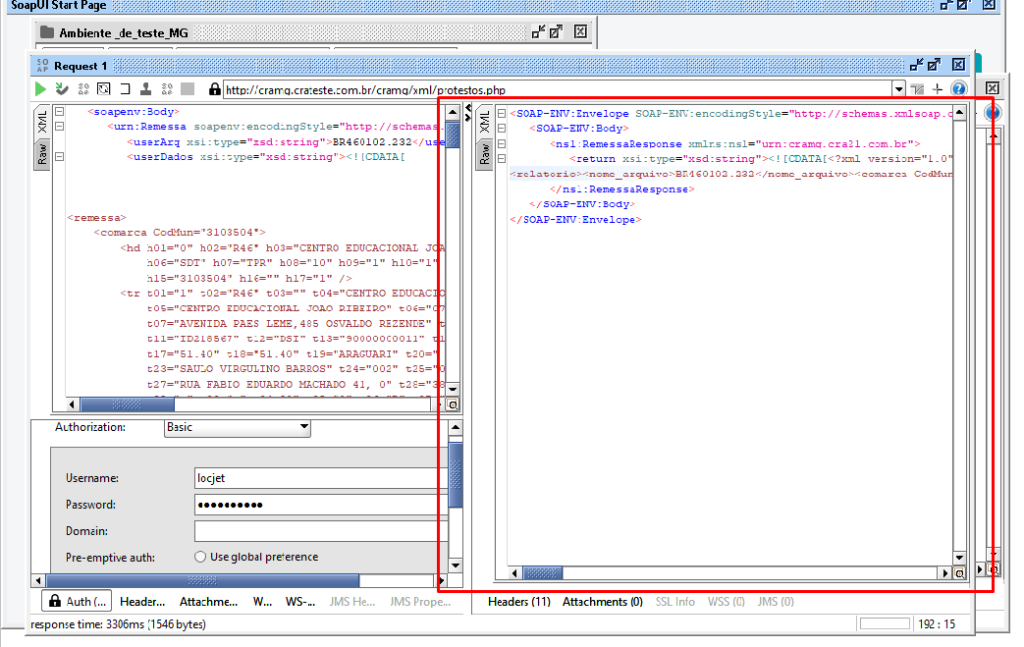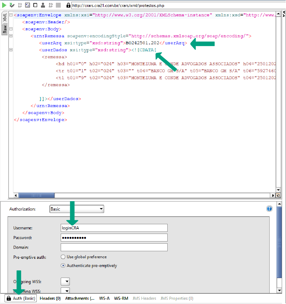 Na janela da sua requisição, selecione a aba Auth (Basic). Preencha os campos Username e Password com as credenciais fornecidas pelo gestor da CRA e marque a opção “Authenticate pre-emptively”. Para inserir o conteúdo do seu arquivo de teste, utilize a tag CDATA no corpo da requisição: <![CDATA[inserir aqui no formato XML o conteudo da remessa]]>