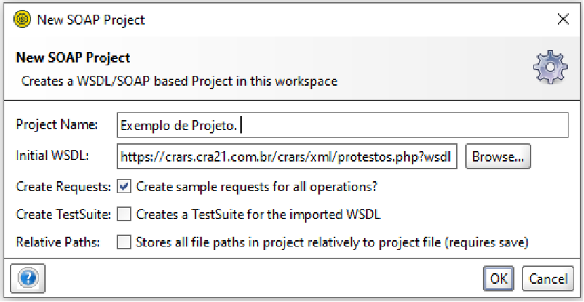 Na janela de criação de projeto, preencha os campos com um nome para o seu projeto e, mais importante, com o link para a conexão WSDL fornecida.